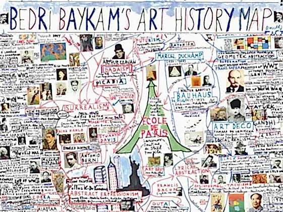 Sanat tarihi haritasının en tepesinde, Rönesans’tan önce dünyanın farklı noktalarında ve dönemlerinde iz bırakmış değişik kültürlerin, medeniyetlerin hatırlatmaları var. Harita’nın sağında ve solunda...